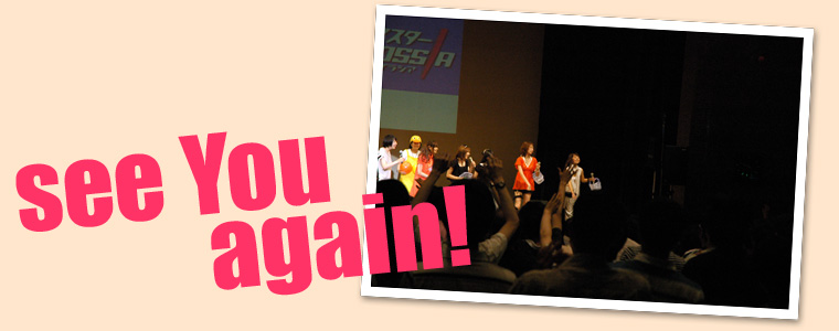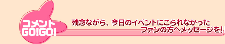 ●小清水亜美さん(高槻やよい 役) 見にこられなかった方、朗報です。今日の公開録音、ネットラジオ「春香とやよいの弥生式らじお」でちょっとだけ流します!こちらで流すために、私と井口裕香ちゃんが司会をしていたわけですからね。イベントにきた方は歌も聞けたり、私たちの振り付けも見られたりと、色んな見所があったと思うんですけども、こられなかった方も少しだけ、その楽しかったものを堪能していただけたら・・・、と思います。是非是非「春香とやよいの弥生式らじお」を聴いてくださいね! ●井口裕香さん(天海春香 役) イベントにこれなかったという方、本当に私も残念なんですが、亜美っけ(小清水さん)も言った通り「春香とやよいの弥生式ラジオ」でちょこっとだけ流すので、そちらを聴いて楽しみつつ、想像していただけたらいいなと思います。でも、こうして出演者の皆さんが着ている可愛いお洋服だったり、歌だったり、トークだったりというところが見れないのは本当にもったいないねっていう感じですけれども(笑)。応援を沢山していただければ、きっと次があると思うので、是非沢山メールなどを送っていただけると嬉しいです。 ●堀江由衣さん(萩原雪歩 役) 今日は本当に賑やかで、アフレコ現場もそうなんですけど、皆で楽しく良いチームワークで作っている作品です。お話の方は今後どんどん核心に迫る、重たいお話になっていきます。特に春香とかね…、うふふふ。もう1回どん底に落ちる…、みたいなお話になっていって、その辺もオンエアを楽しみに見ていただけたらなと思います。 ●喜多村英梨さん(菊地 真 役) 本当に残念だったね〜。ほんとレアでしたよ、今日は色んな意味で(笑)。堀江さんも今までにないくらい悪ノリして下さっていて、私はいつも悪ノリしてるんですけども(笑)、今日のクイズ大会なんかでも、女子たちのキャピキャピした楽しい雰囲気が会場に伝わっていたのではないかと思います。来られなかった方は、まぁ・・・、妄想しつつですね、皆さんの応援があれば絶対次回もあるはずなので、「アイマス」を引き続き応援してくれればな、と思います。 ●中原麻衣さん(秋月律子 役) 外れちゃったのはしょうがないので(笑)、運をためたと思って今度は何か大切なときのために使ってください。まぁ、凄く楽しかったですけどね(笑)。でも、そんなこと言ったら、来られなかった人が可愛そうなので…。そうでもなかったよ、今日(笑)。今日はそうでもなかったから、まぁいいよ。また今度来てね(笑)。今度来たらいいと思います。ありがとうございました! ●名塚佳織さん(双海亜美 役) 今回来られなかった方は残念でしたが…。夏はまだこれからなので、この面子でまたってことは難しいかもしれませんが、きっと個々であるイベントだったりには行けると思うので、そういうところでまだまだ皆さん夏を楽しんで頂けたらなと思います。 ●斎藤桃子さん(双海真美 役) 当選しなくて、本当に悲しいことでしたね…。大変だった、残念だったと思いますが、気を落とさないで頑張ってください(笑)。小清水さんと井口さんの踊りがすごく可愛くて楽しかったので、見られなかった方は残念だと思いますが、またこういう機会があったら、きっとまた踊ってくれると思います。お楽しみに! ●清水香里さん(如月千早 役) 本当に、リハーサルから皆テンションが高くて、このメンバーといるとついつい騒いでしまう、とても楽しいイベントでした。そして、「本当は私はいい人です」ということを声を大にして言いたいです(笑)! |