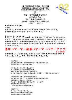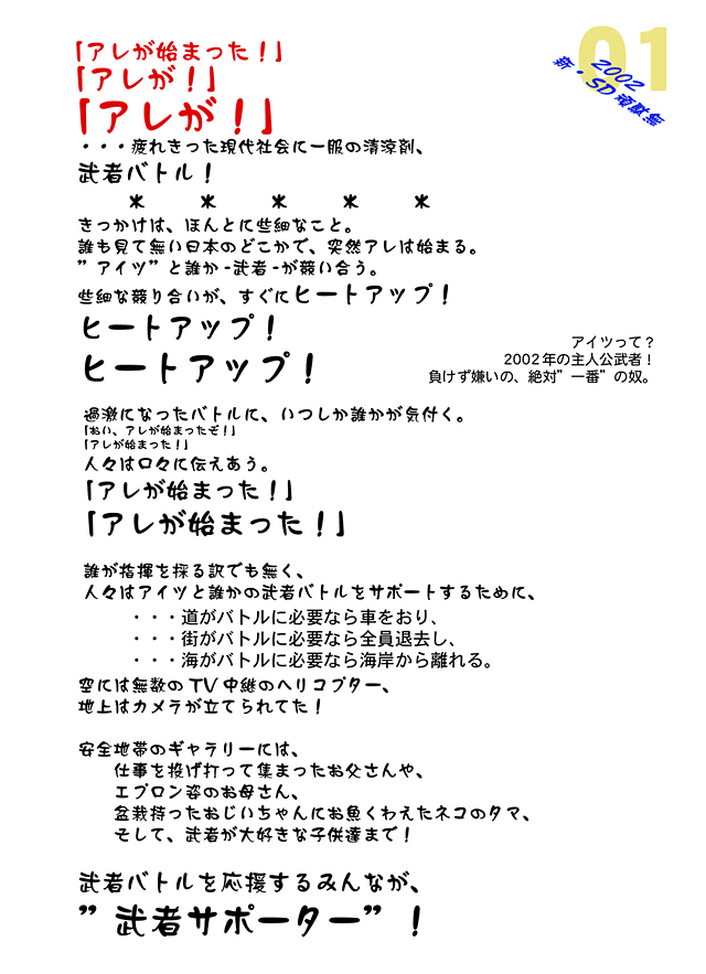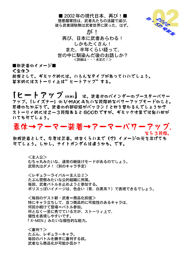 ただこの企画メモで目(め)につくのは……2002年(ねん)、またまたやってきた武者たちがもうすっかり日本(にほん)になじんでいて、武者バトルなる非合法(ひごうほう)バトルをはじめてしまう、そのなかで修業(しゅぎょう)にきていたチビ武者が実は主人公で……なんてことからキーワードは“ヒートアップ”。