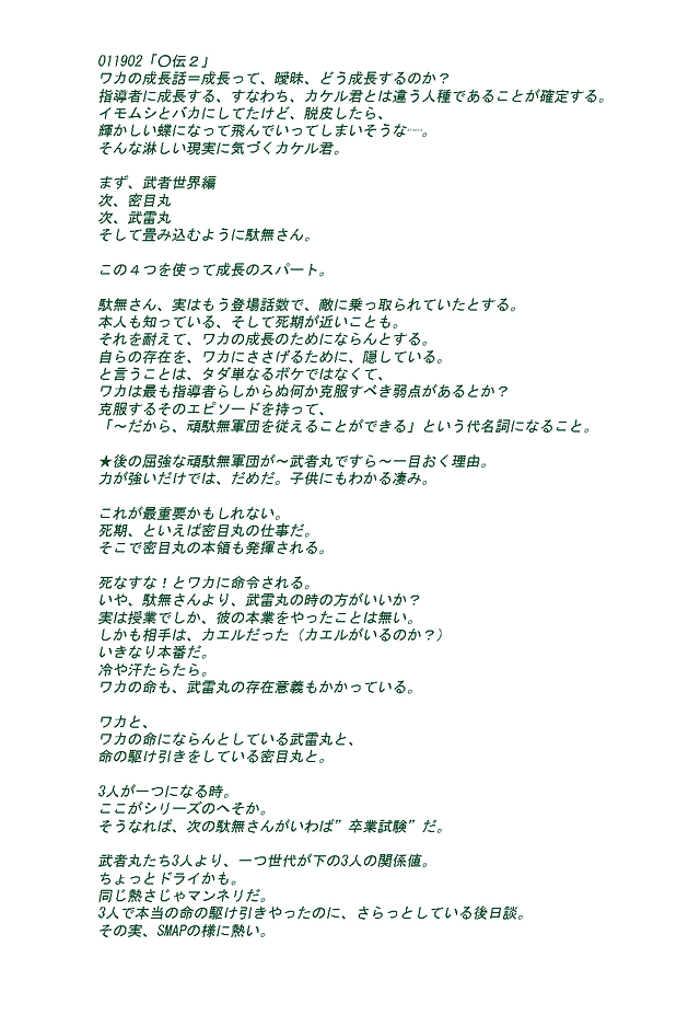 苛酷(かこく)な命(いのち)のかけ引(ひ)きの中(なか)で、仲間(なかま)とのきずなを深(ふか)め、成長(せいちょう)を遂(と)げた三若武者(さんわかむしゃ)。號(ゴー)さん(初期設定(しょきせってい)では駄無(ダム)さん)の命を賭(と)した教育(きょういく)も、すべては武者世界(むしゃせかい)全体(ぜんたい)の未来(みらい)と、ワカの成長を思(おも)えばこそです。パートナー〈カツミン〉、友(とも)〈ブライト、ハッチャン〉、師匠(ししょう)〈撃(ゲキ)さん、號さん〉、強敵(きょうてき)〈烈號(レツゴー)〉たちの協力(きょうりょく)や支(ささ)え、そして試練(しれん)といった様々(さまざま)な関係(かんけい)を通(とお)して、ワカはみんなの想(おも)いにこたえられる次期大将軍(じきだいしょうぐん)へと成長したのでした。