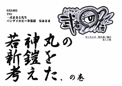 って、堀口大明神(ほりぐちだいみょうじん)は言(い)っていますが、皆(みな)さんどうですか? 神武兜頑駄無(カブトガンダム)にまつわるメモを数(かぞ)えていったら、あと十数回(じゅうすうかい)あるみたいですよ。ワカ様(さま)ファンにはたまらない内容(ないよう)であることは間違(まちが)いないのですが、みんなが「○伝3」の秘密(ひみつ)を早(はや)く知(し)りたい気持(きも)ちもわかるし……。ワカ様は「2月(がつ)10日(か)までご意見(いけん)欲(ほ)しいですぅ〜」といっているようですが、どうでしょうか?