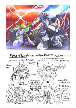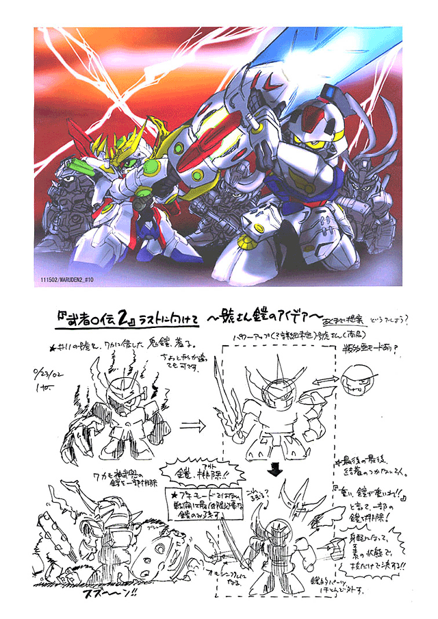 当初(とうしょ)のアイディアでは、危機(きき)に瀕(ひん)したワカの元(もと)に、多(おお)くの武者(むしゃ)たちが集結(しゅうけつ)するシーンもあったようです。結局(けっきょく)はアイディアメモにあったように、武者軍団(むしゃぐんだん)の助(たす)けの必要(ひつよう)もなく、ブライト、ハッちゃんがワカ様(さま)を救(すく)うことになるのですが。その後(あと)のファイナルバトルは、仲間(なかま)の気持(きも)ちを受(う)けたワカが最大(さいだい)の敵(てき)に挑(いど)み、次期大将軍(じきだいしょうぐん)の貫禄(かんろく)を見(み)せるシリーズ屈指(くっし)の名(めい)エピソードです。
