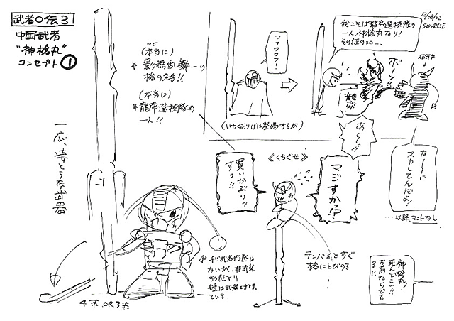 天宮(アーク)と海(うみ)をへだてた大陸(たいりく)の国(くに)「影舞乱夢(エイブラム)」からやってきた神槍丸(シンソウマル)。異国(いこく)の武者(むしゃ)である神槍丸は、伝説(でんせつ)の槍(やり)「天宮乱夢(アークラム)」で龍(りゅう)を出現(しゅつげん)させたり、空飛(そらと)ぶ雲(くも)「龍招雲(りゅうしょううん)」に乗(の)れるなど、一風(いっぷう)変(か)わった能力(のうりょく)を持(も)っています。また、飛脚(ひきゃく)として天宮の国(くに)を飛(と)び回(まわ)り、武侍丸(ブシマル)&鉄板丸(ブリキマル)の武器(ぶき)「知(ち)の鎧(よろい)」と「木鍛刀(ぼくたんとう)」を、二人(ふたり)に授(さず)ける役目(やくめ)を果(は)たしました。「そんなことあったっけ?」というキミは、コミックス「武者○伝(ムシャマルデン)3」第1巻(だいいっかん)をチェック!