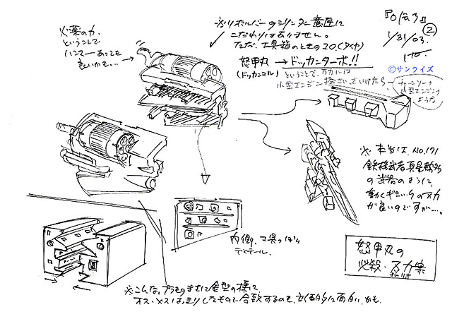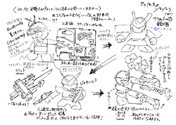 | それぞれのカテゴリー、業種(ぎょうしゅ)で強(つよ)いヤツら! 誰(だれ)が一番(いちばん)かわからない……というのがたくさん武者(むしゃ)の出(で)る「3」のコンセプトなんですが、つまるところは鎧(よろい)に精通(せいつう)しているヤツは侮(あなど)れないんじゃない?というのが努貫丸(ドッカンマル)です。BB戦士(ビービーせんし)ファンの方々(かたがた)にはおわかりのとおり、努貫丸は金型(かながた)ヴァリエーション商品(しょうひん)なのに、好(す)き勝手(かって)に考(かんが)えてますね。ところが!一式先生や寺島さん、バンダイさん皆(みな)さんのセンスと努力(どりょく)で、ヴァリエーションとは思(おも)えぬ出来(でき)の商品(しょうひん)は必見(ひっけん)です。いやあ、マジでビックリしました。ちなみに万力(ばんりき)というアイデアも、他(ほか)のロボットモノ作品(さくひん)のボツったアイデア流用(りゅうよう)だったりして。ガガガ……。 |
