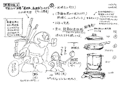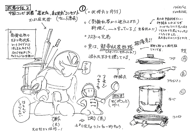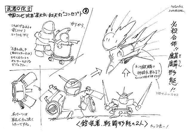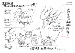 | 2体(にたい)セットの特別商品(とくべつしょうひん)で合体(がったい)して麒麟(きりん)になる、というバンダイさんの意向(いこう)を元(もと)に、これまたコンセプトは好(す)き勝手(かって)に考(かんが)えていますが、プラモデルはよくぞ変形合体(へんけいがったい)したもんだとスタッフながらに驚(おどろ)きです。というか、努貫丸(ドッカンマル)も火威獣丸(カイジュウマル)もそうですが、このころになるとデザインチームも設計(せっけい)チームも慣(な)れてきたうえで手(て)を抜(ぬ)かないというか、いわば立体(りったい)パズルでぎりぎりの解答(かいとう)をだしている感(かん)じです。当初(とうしょ)はメモにあるとおり神槍丸(シンソウマル)が探(さが)しもとめる影舞乱夢(エイブラム)の王子(おうじ)さまという設定観(せっていかん)もあったのですが、構成上(こうせいじょう)描(えが)ききれないのでスパッとやめて、ボケたキャラになりました。泣(な)くなバカ兄弟(きょうだい)! |