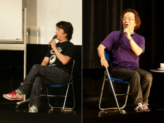 内田健二プロデューサーと司会の尾崎雅之取締役