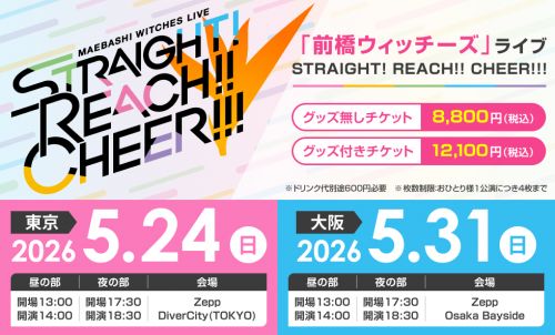 2026年5月24日(日)及び5月31日(日)東京会場と大阪会場にて『前橋ウィッチーズ』ライブ STRAIGHT! REACH!! CHEER!!! の開催が決定しております!
